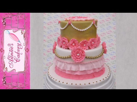 Pink & Gold Floral Birthday Cake - Birthday Cake Pink And Purple - Unlike many of my cakes, this one is piped with buttercream icing. Simple ruffle flowers, gold beads and fondant skirt ruffles to make a complete creation.